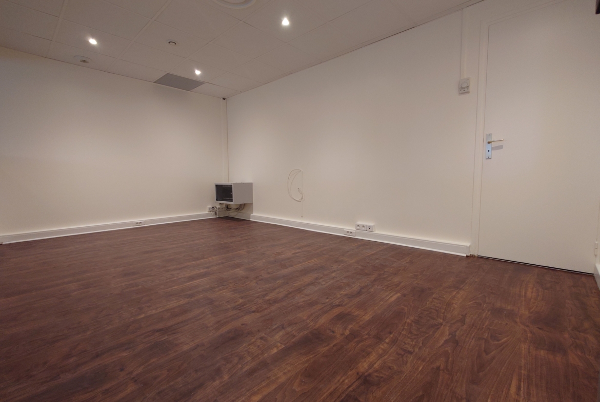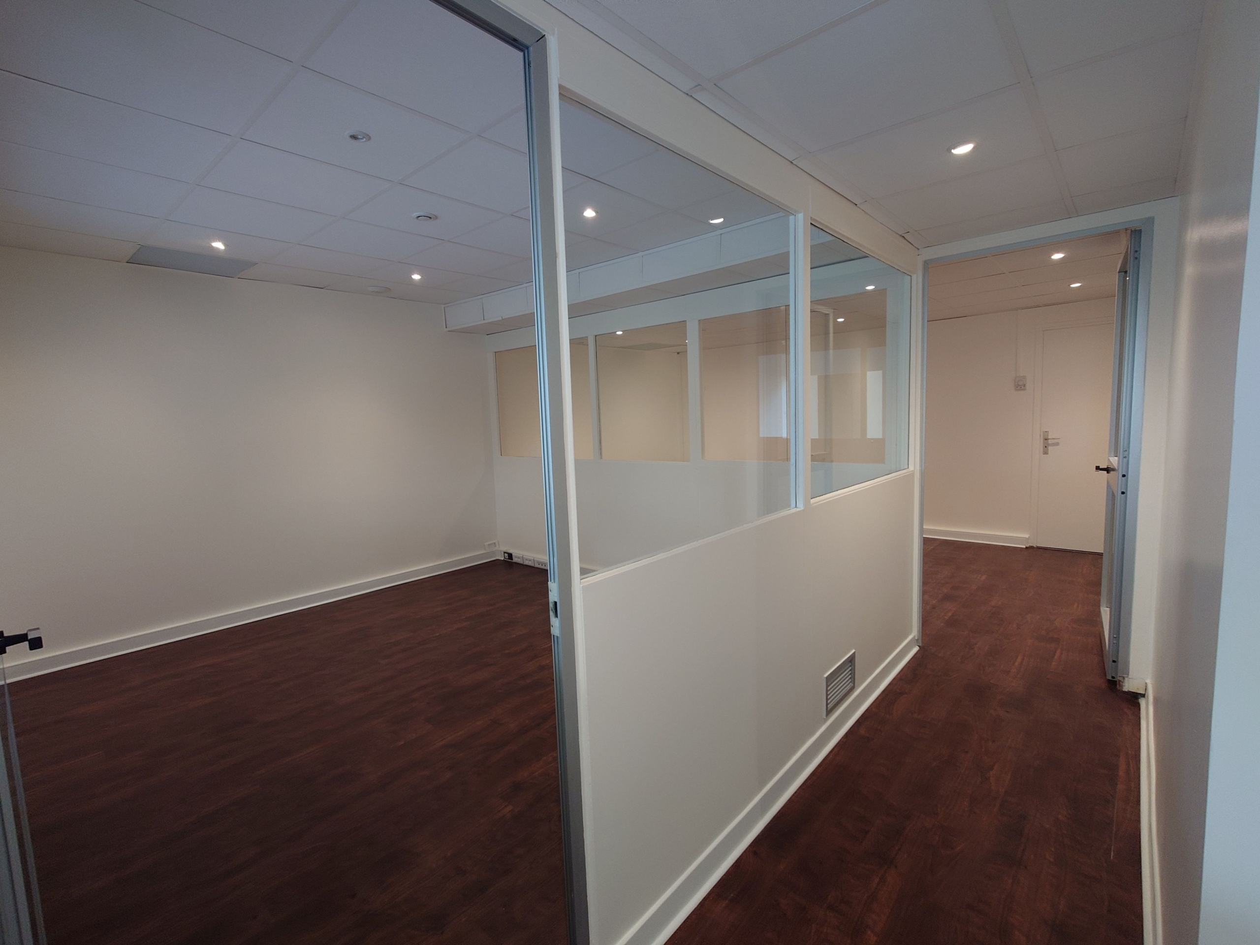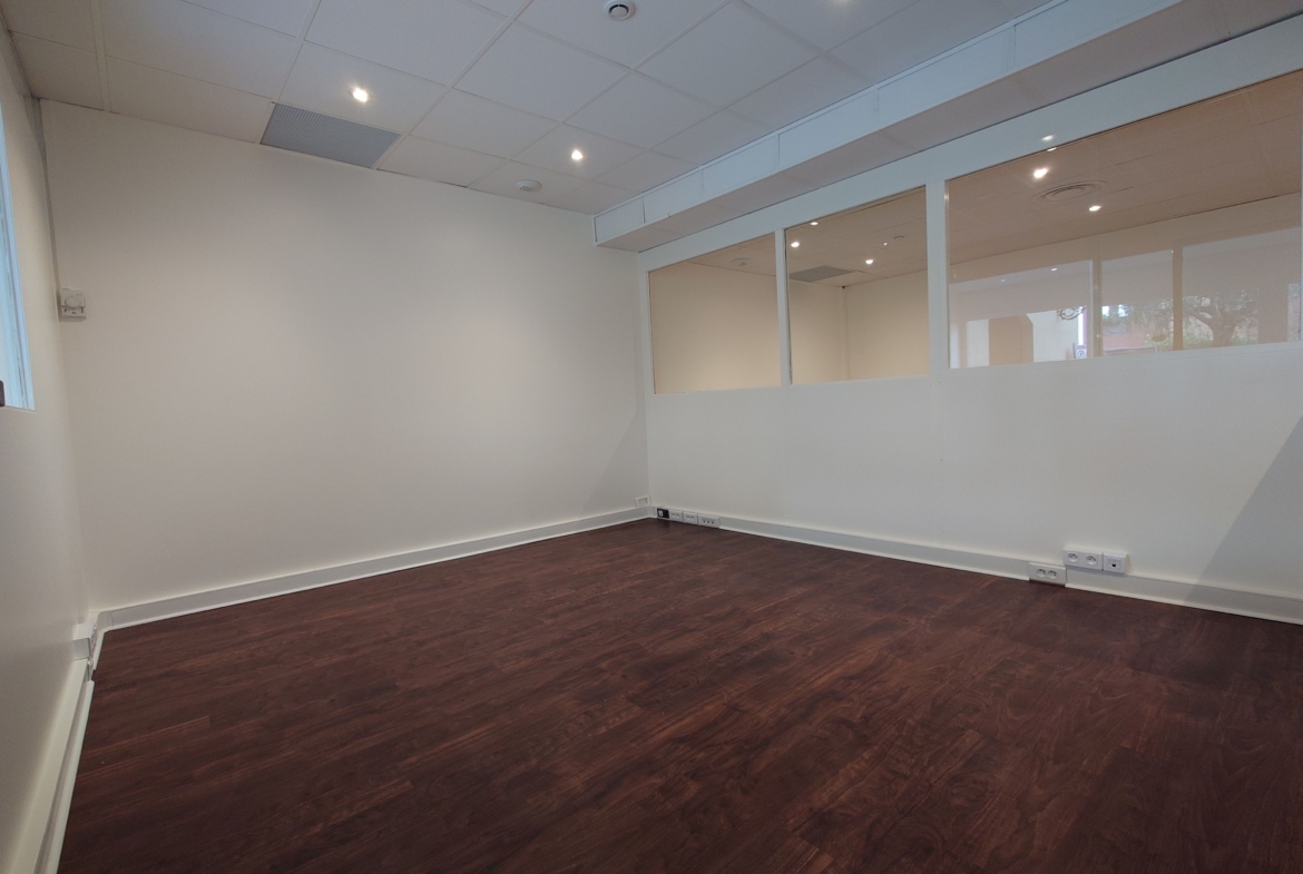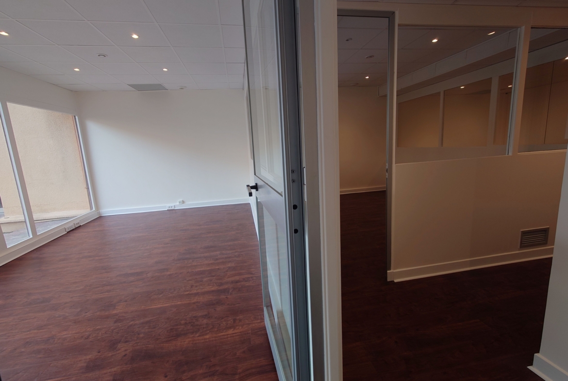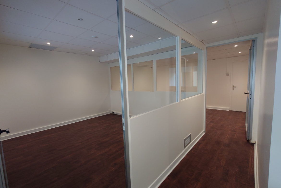 It comprises a main room with three offices separated by glass partitions, an airlock, a kitchenette and toilets. It also has a large shop window, offering excellent visibility.
